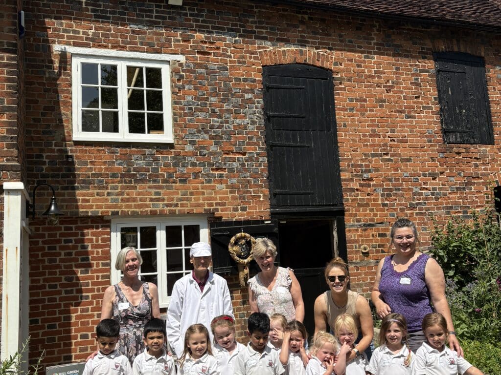 We were so excited on Thursday morning for our Nursery outing on a coach to Mill Green Museum at Hatfield. Once we were all ready we boarded the coach and off we set. On the way we passed by some of our houses, we saw cows and horses in the field and the river Lea. We sang songs on the way and talked all about the things that we were going to do at the Mill. When we arrived we had snack sitting in the shade of a tree and we met Melissa who had organised our day. First we went to listen to the story ‘Little Red Hen’ and we were shocked at how unkind Hen’s friends were not helping her to grow the wheat. After the story we split into two groups and whilst one group went to meet Simon the miller and learn all about how the grain from the wheat is turned into flour, the other group went to make bread rolls with the baker Freddie. In the bakery we mixed the ingredients to make the dough, and learnt that the dough had to prove. We then made the dough into two balls and made a snowman, then put our pointy finger through both balls to make a little loaf. In the mill we used a mini mill stone to grind the grain and we watched the miller open the gates to let the water flow through and turn the large millstones. We then saw the soft flour flowing down into the flour bags. Our busy day continued with planting cress seeds and a play with grain and cogs and dressing up in miller’s clothes. At the end of the morning we had a lovely picnic under a shady tree before the coach arrived and brought us back to school. Our teachers were super proud of the way we behaved, how polite we were and how engaged we were during the whole outing.