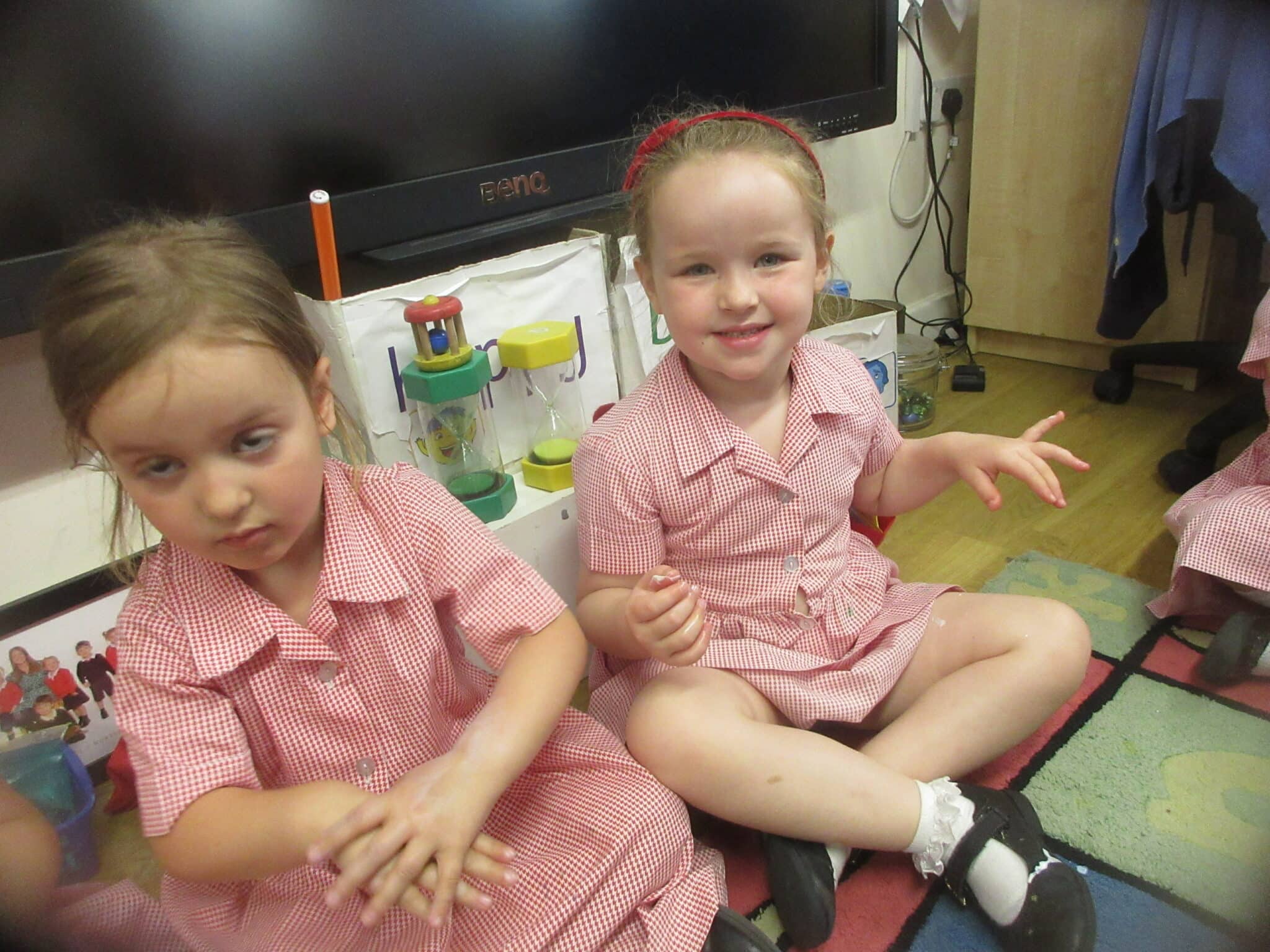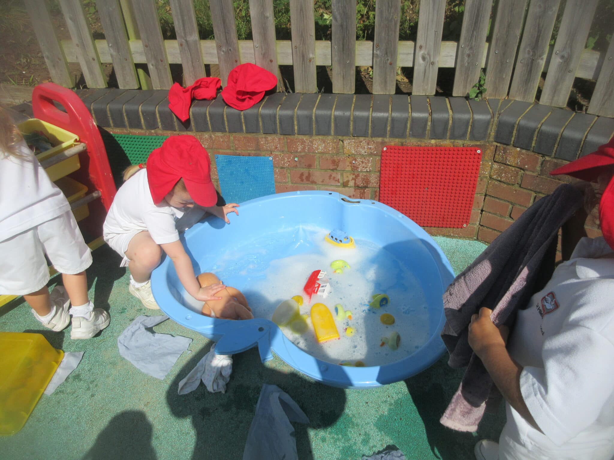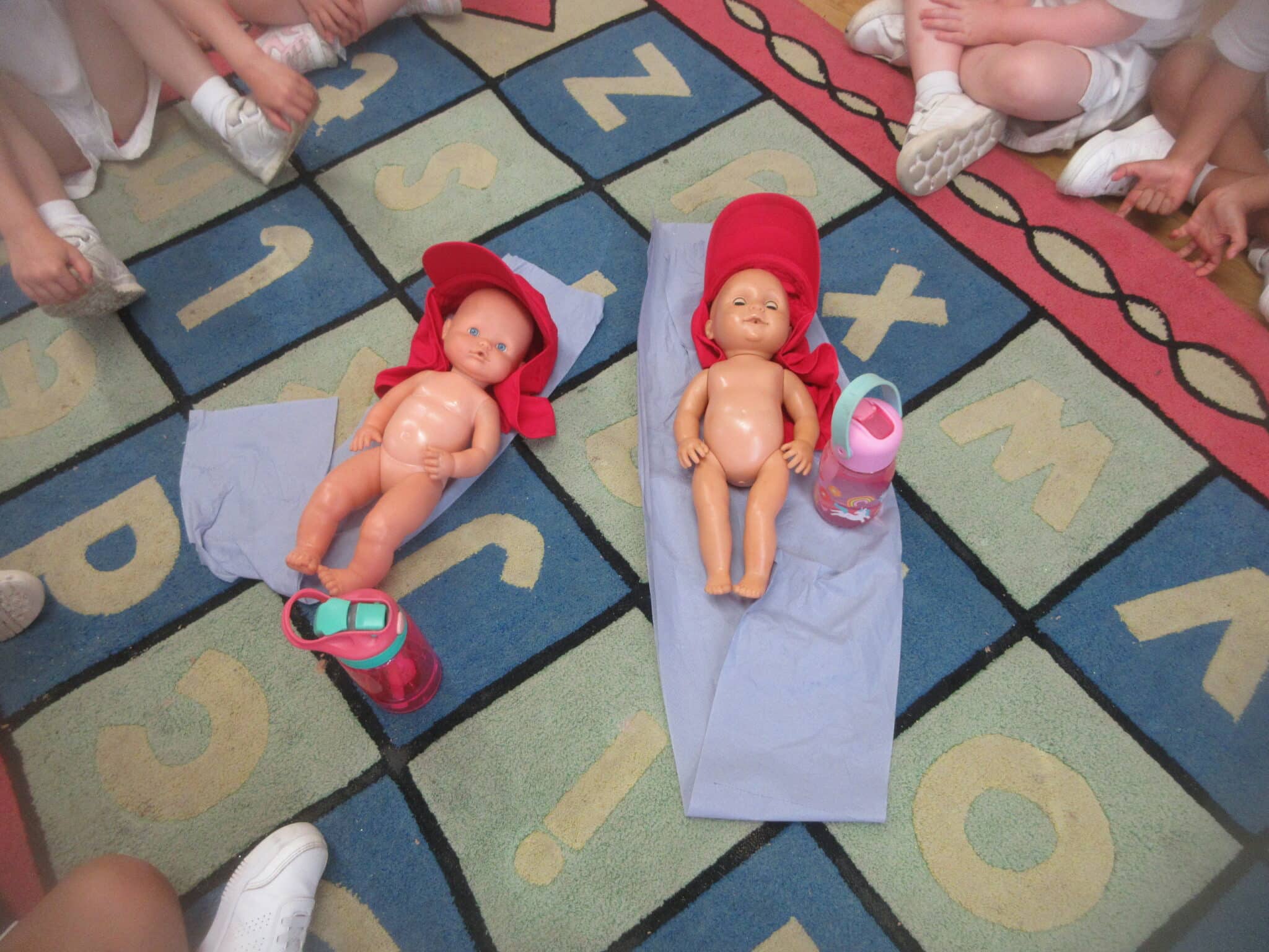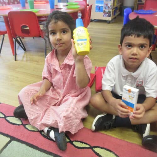 We started our morning learning to keep ourselves safe in the sun. We remembered that in the summer we need to remember to put sun cream on to protect our skin from the sun’s harmful UV rays. We learnt that there are different factors of sun cream for different colour skin types and for use in different temperatures. Some of us recognised factor 30 on Mrs Radgman’s sun cream and factor 50 on Jaime’s. We also found out that we could use sunblock to keep all the sun’s UV rays away from our skin. We knew that it was also important to wear sun glasses to protect our eyes and to never look directly at the sun. We also thought it was good to put a hat on to keep our heads cool and to spend time in the shade. We thought about drinking lots of water to hydrate ourselves and to wear appropriate clothing. We then prepared two dolls to go out to play in the sunshine. Isla and Millie carefully applied sun cream, popped on their hats and then took them for a play in the paddling pool outside. We then listening to ‘Slip, Slop, Slap’, a song all about putting on your sun cream.