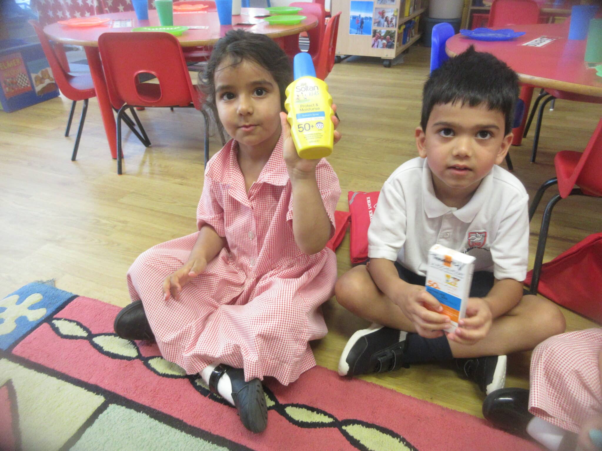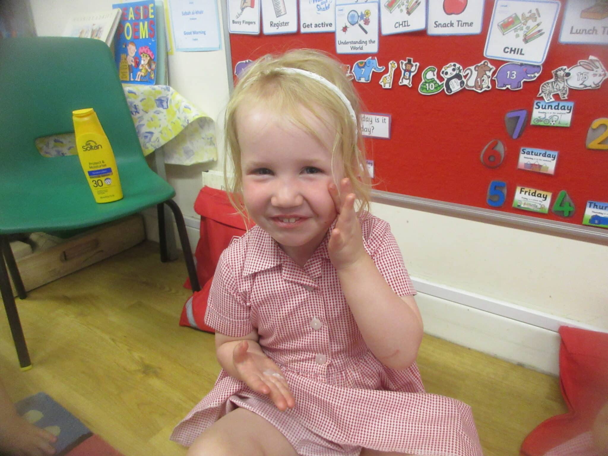 On Tuesday we all brought our own bottles of sun cream to school and after recalling all the information that we had learnt about sun safety, we independently applied our sun cream to make sure that we were safe in the sun during our play. Everyone was very sensible and used the roll-ons, sprays and lotions to apply the different makes of sun cream. Great work Nursery.
