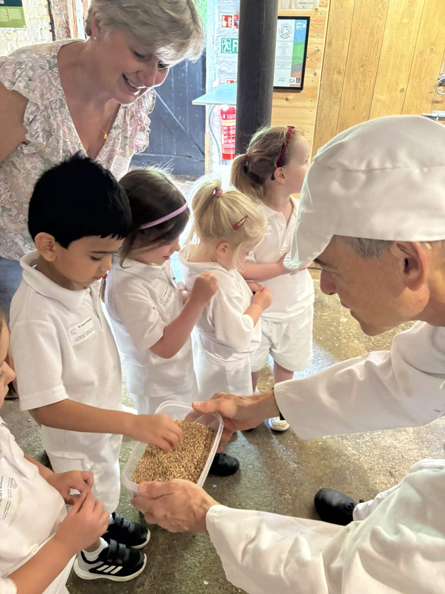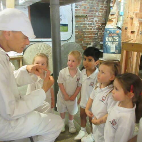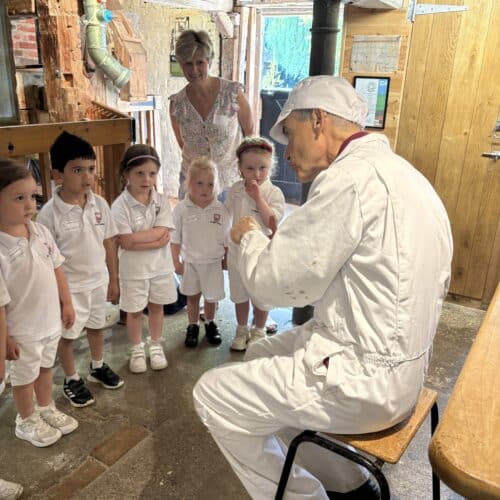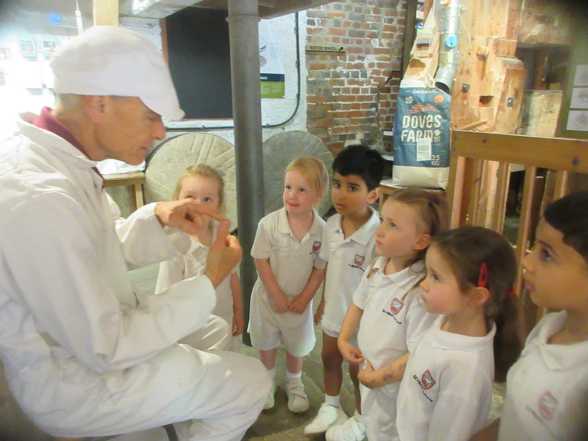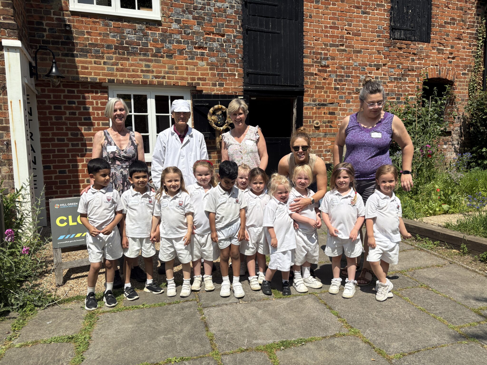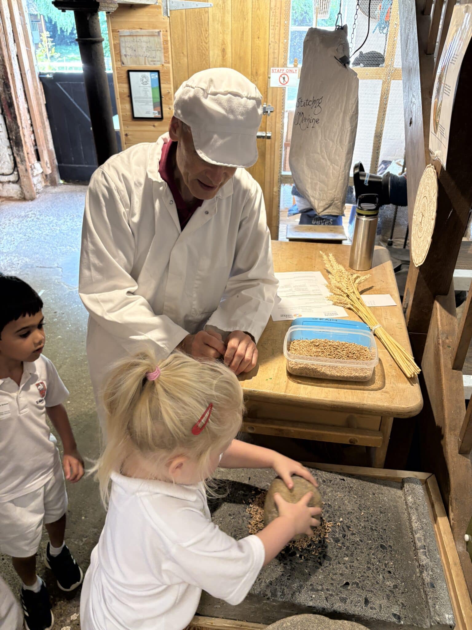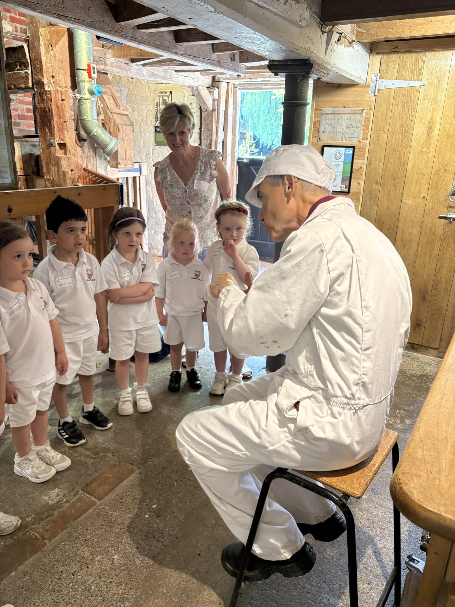 We were so excited on Thursday morning for our Nursery outing on a coach to Mill Green Museum at Hatfield. Once we were all ready we boarded the coach and off we set. On the way we passed by some of our houses, we saw cows and horses in the field and the river Lea. We sang songs on the way and talked all about the things that we were going to do at the Mill. When we arrived we had snack sitting in the shade of a tree and we met Melissa who had organised our day. First we went to listen to the story ‘Little Red Hen’ and we were shocked at how unkind Hen’s friends were not helping her to grow the wheat. After the story we split into two groups and whilst one group went to meet Simon the miller and learn all about how the grain from the wheat is turned into flour, the other group went to make bread rolls with the baker Freddie. In the bakery we mixed the ingredients to make the dough, and learnt that the dough had to prove. We then made the dough into two balls and made a snowman, then put our pointy finger through both balls to make a little loaf. In the mill we used a mini mill stone to grind the grain and we watched the miller open the gates to let the water flow through and turn the large millstones. We then saw the soft flour flowing down into the flour bags. Our busy day continued with planting cress seeds and a play with grain and cogs and dressing up in miller’s clothes. At the end of the morning we had a lovely picnic under a shady tree before the coach arrived and brought us back to school. Our teachers were super proud of the way we behaved, how polite we were and how engaged we were during the whole outing.