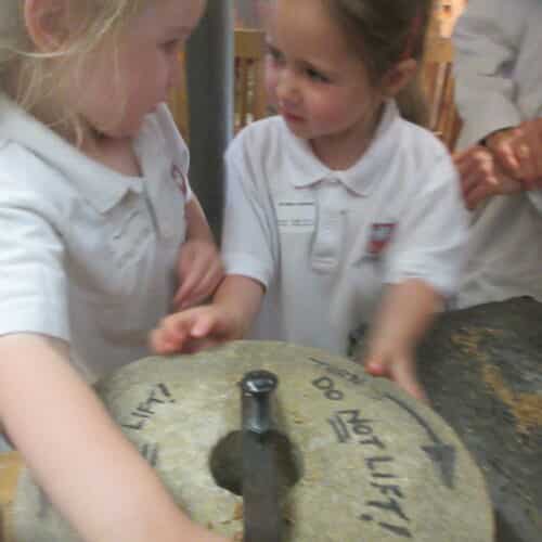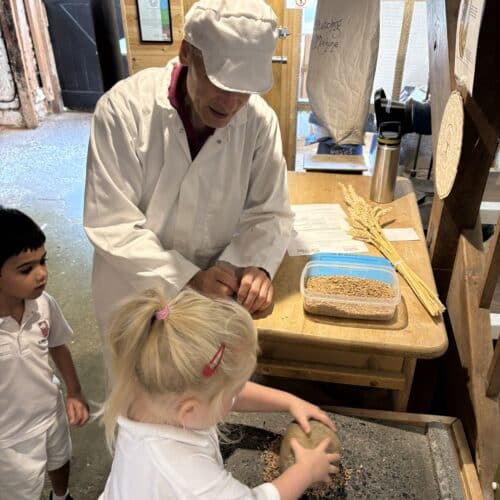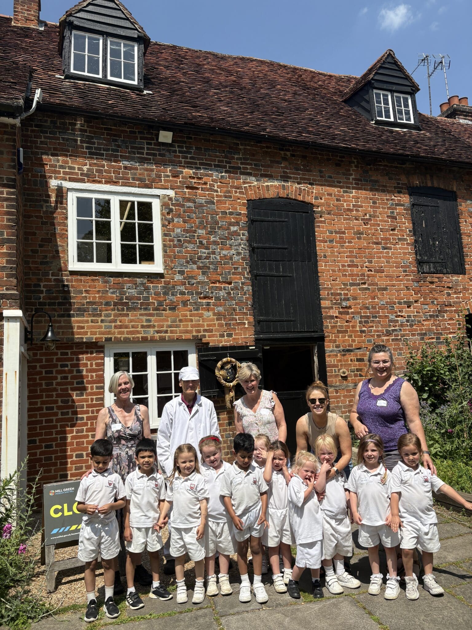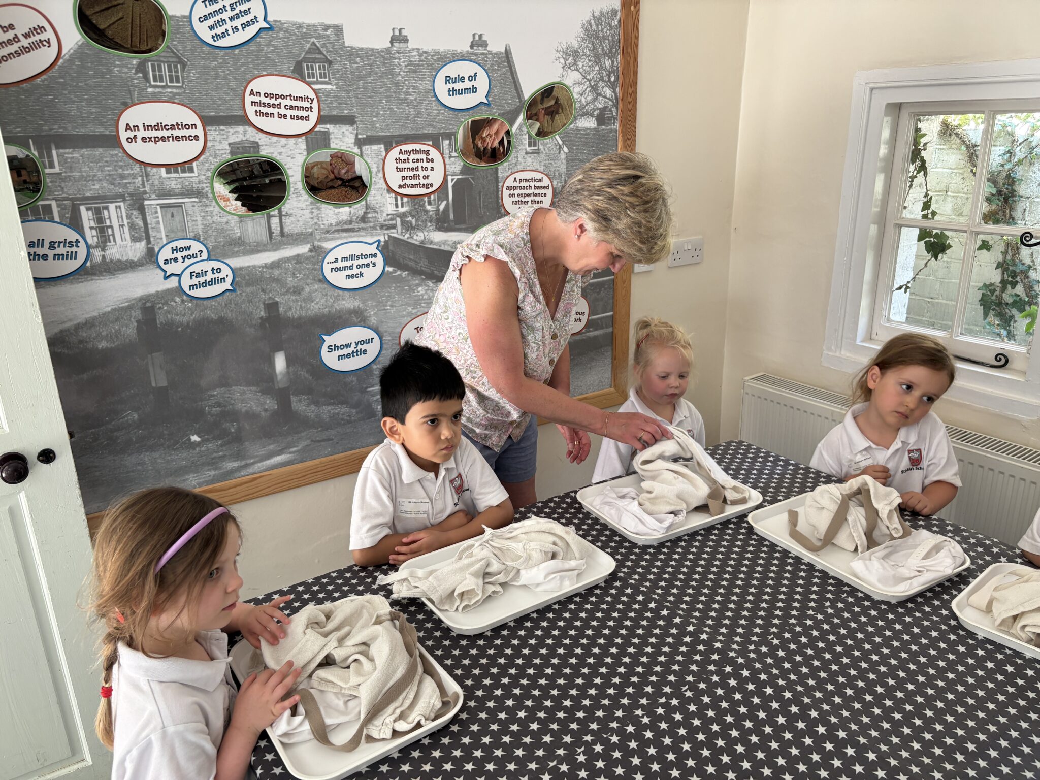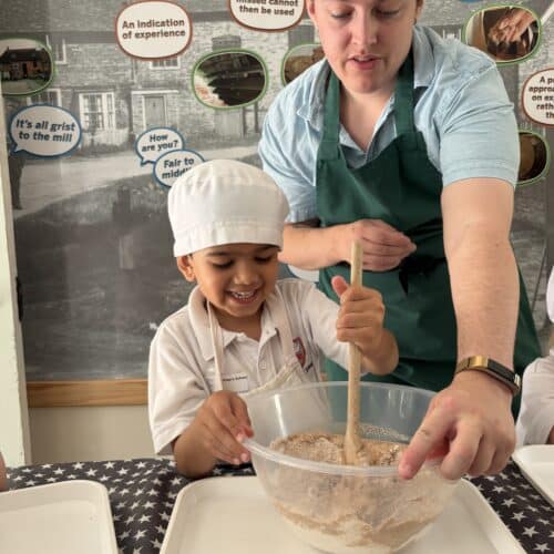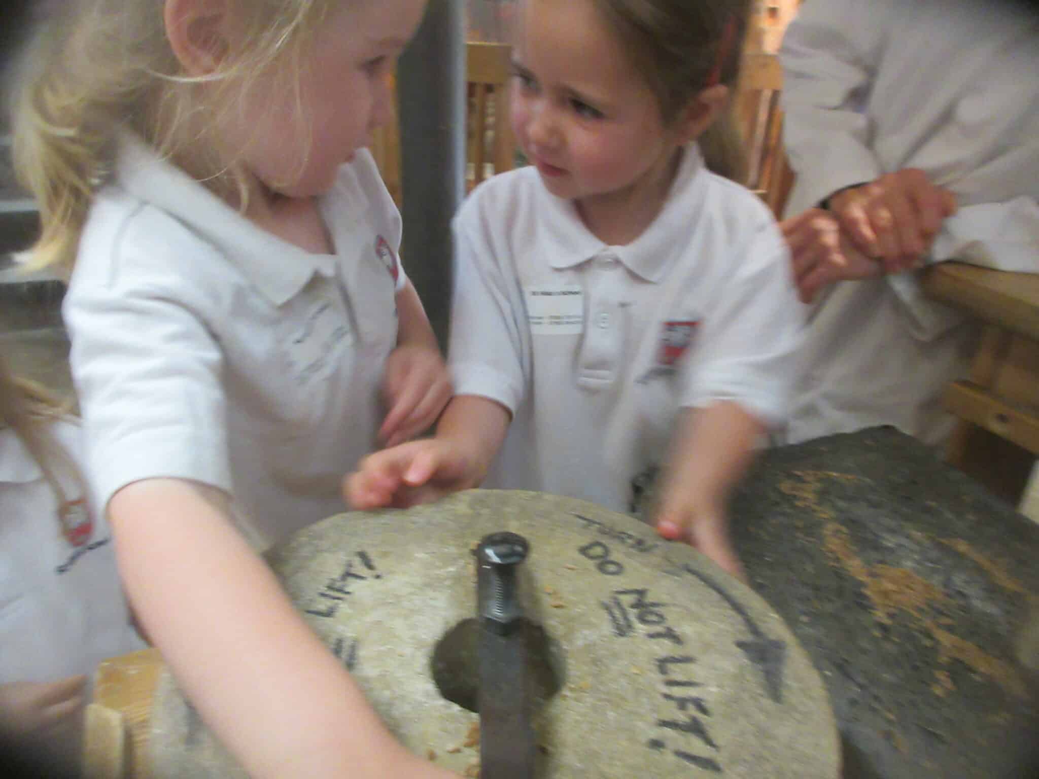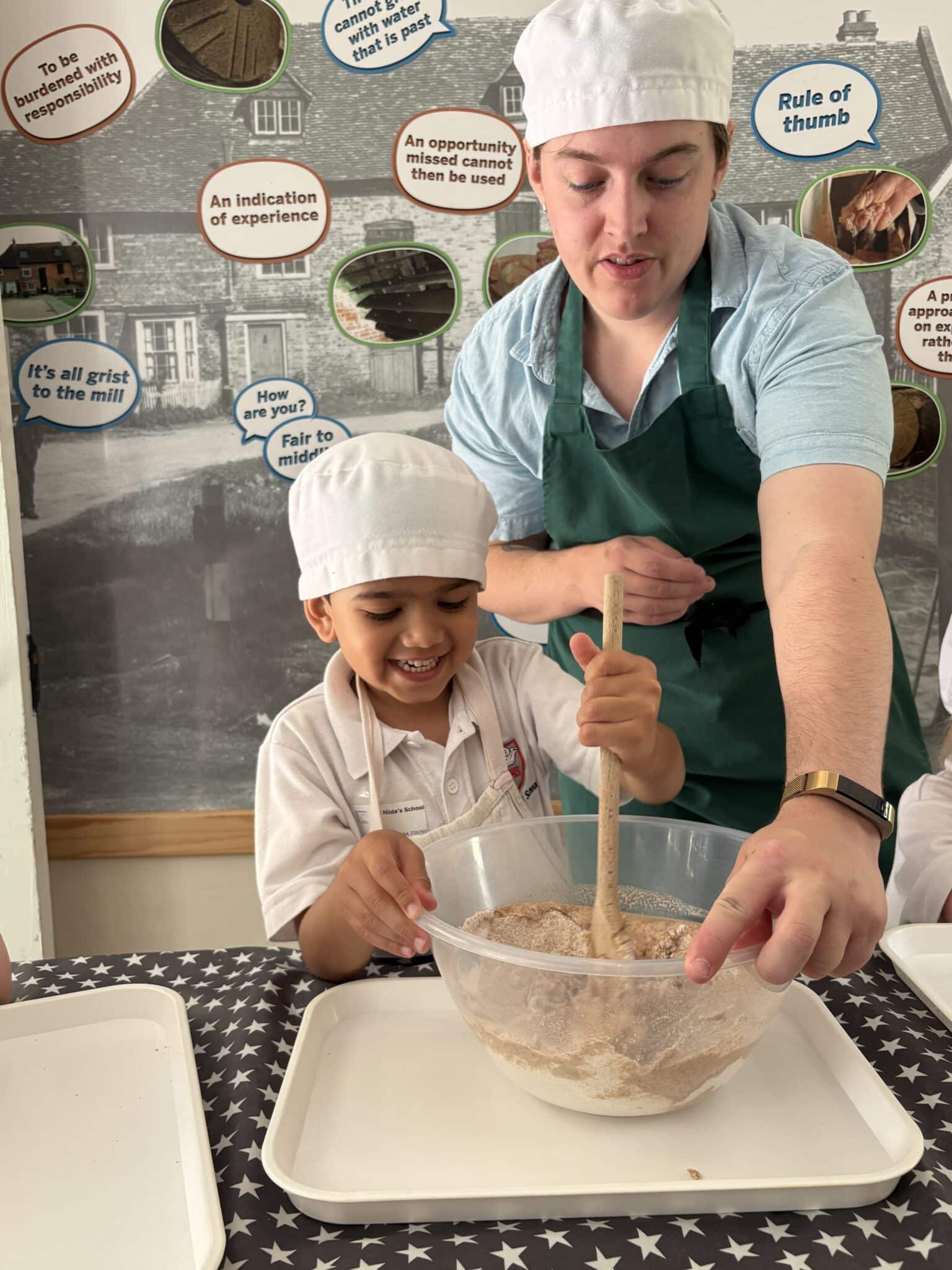 We were so excited on Thursday morning for our Nursery outing on a coach to Mill Green Museum at Hatfield. Once we were all ready we boarded the coach and off we set. On the way we passed by some of our houses, we saw cows and horses in the field and the river Lea. We sang songs on the way and talked all about the things that we were going to do at the Mill. When we arrived we had snack sitting in the shade of a tree and we met Melissa who had organised our day. First we went to listen to the story ‘Little Red Hen’ and we were shocked at how unkind Hen’s friends were not helping her to grow the wheat. After the story we split into two groups and whilst one group went to meet Simon the miller and learn all about how the grain from the wheat is turned into flour, the other group went to make bread rolls with the baker Freddie. In the bakery we mixed the ingredients to make the dough, and learnt that the dough had to prove. We then made the dough into two balls and made a snowman, then put our pointy finger through both balls to make a little loaf. In the mill we used a mini mill stone to grind the grain and we watched the miller open the gates to let the water flow through and turn the large millstones. We then saw the soft flour flowing down into the flour bags. Our busy day continued with planting cress seeds and a play with grain and cogs and dressing up in miller’s clothes. At the end of the morning we had a lovely picnic under a shady tree before the coach arrived and brought us back to school. Our teachers were super proud of the way we behaved, how polite we were and how engaged we were during the whole outing.